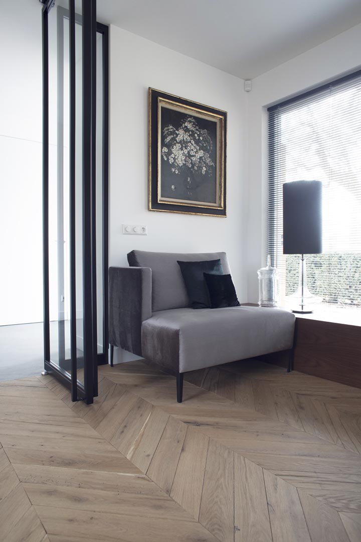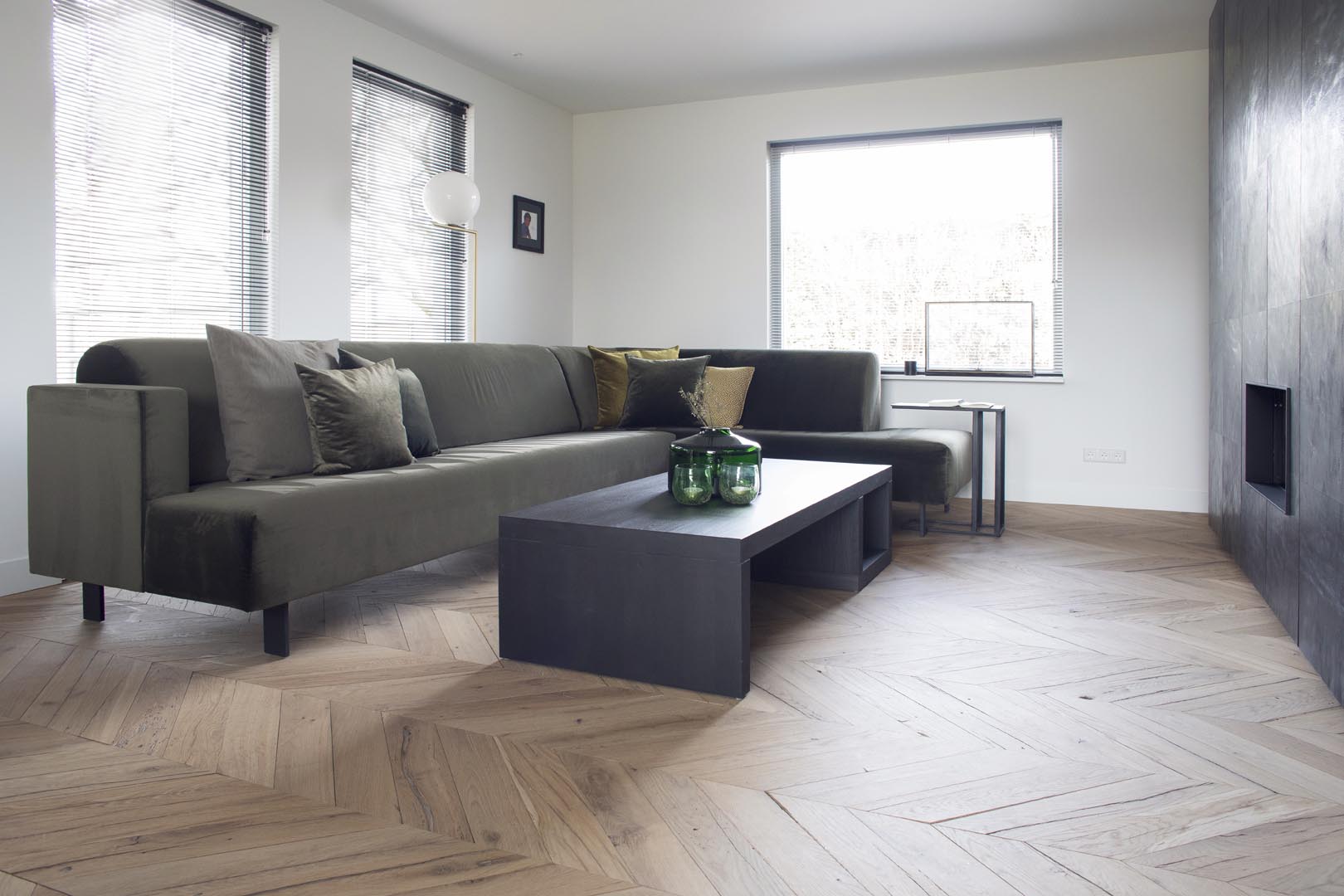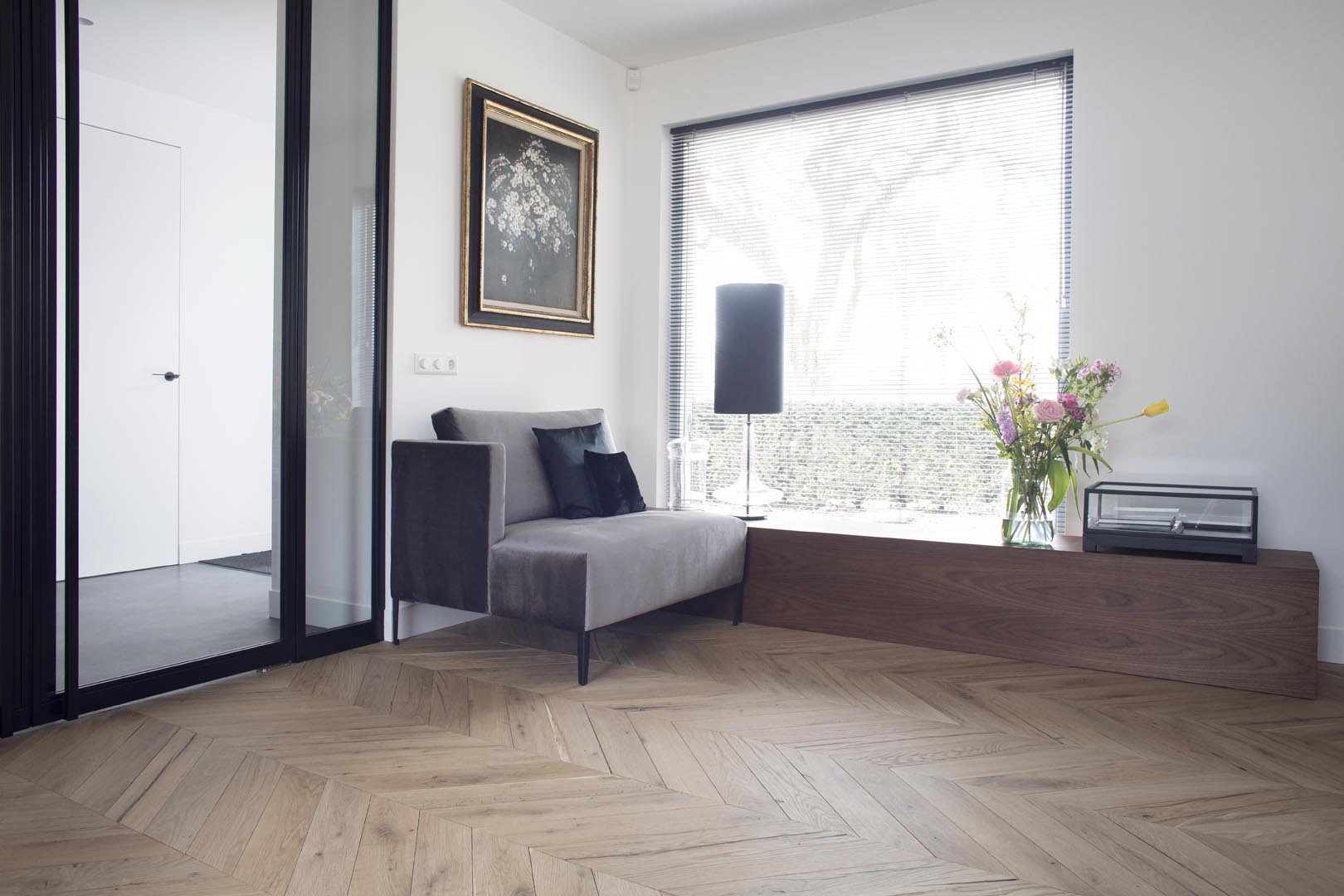 Voor een moderne, luxe uitstraling is de vloer gelegd in een Hongaarse punt.