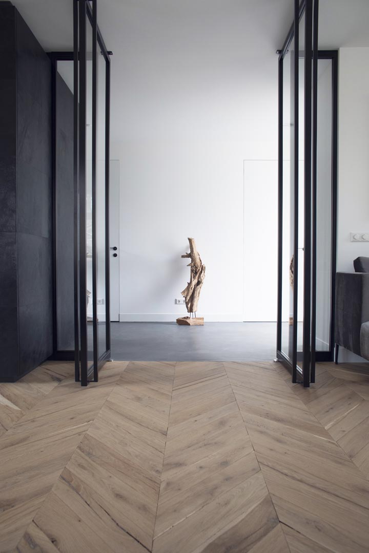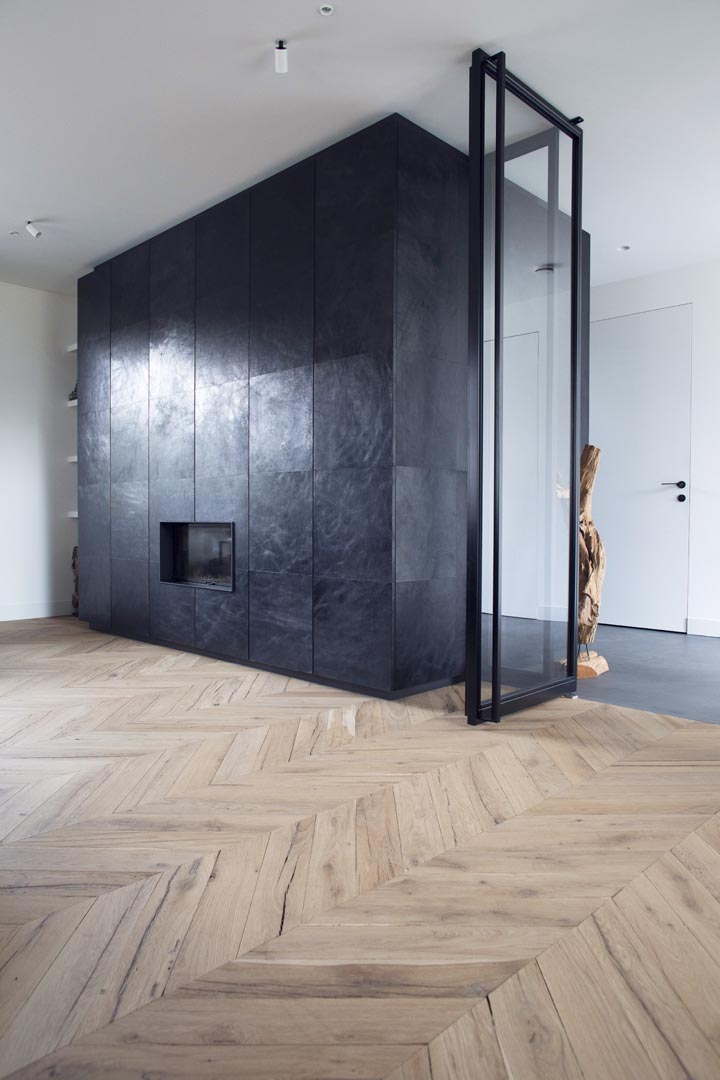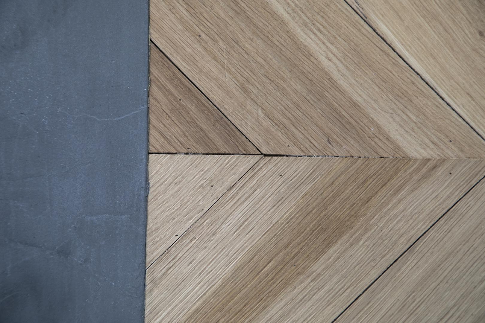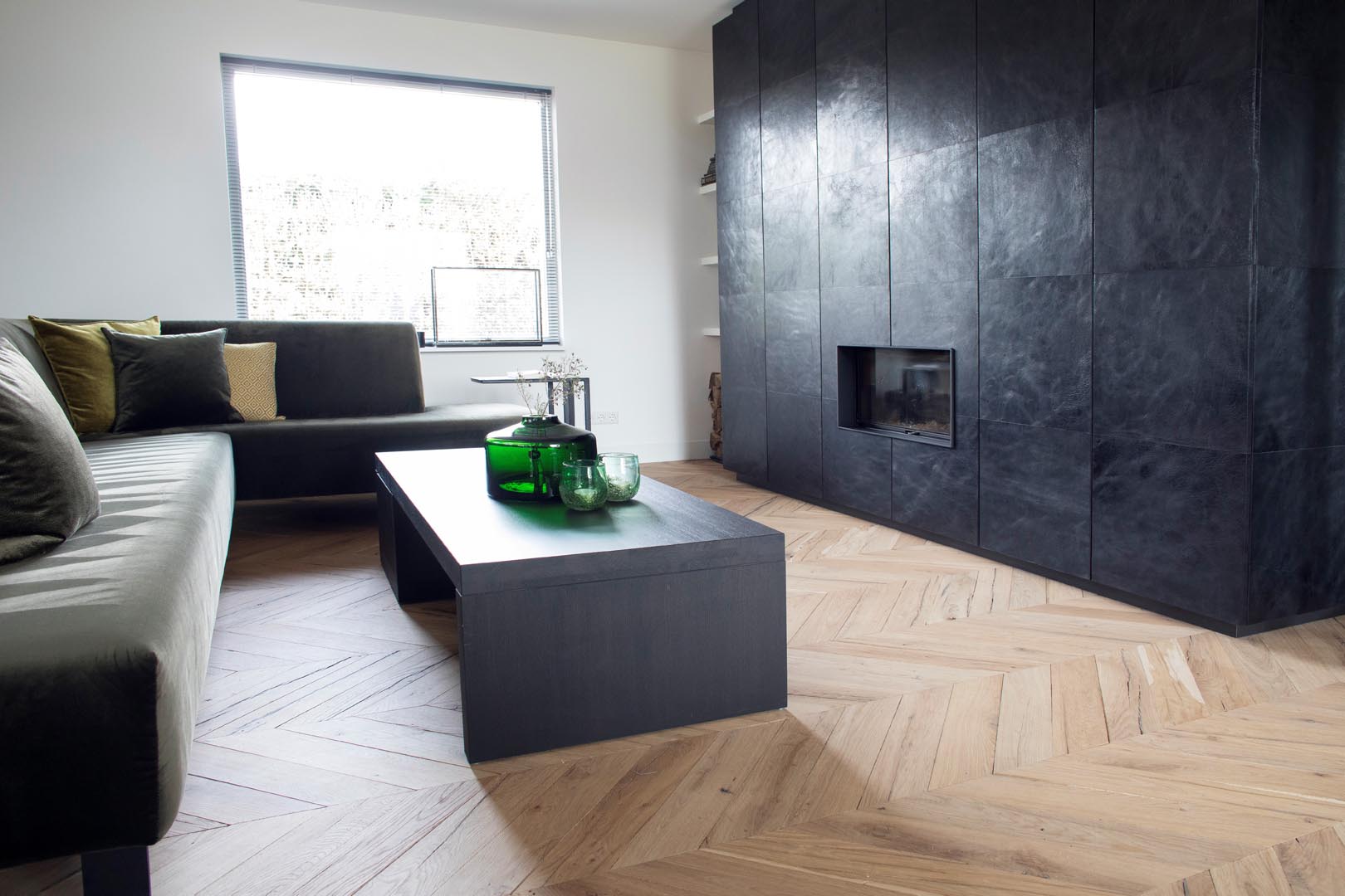 Voor een moderne, luxe uitstraling is de vloer gelegd in een Hongaarse punt.