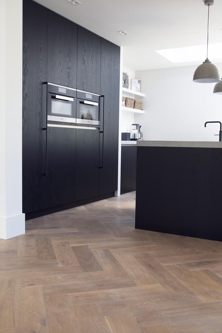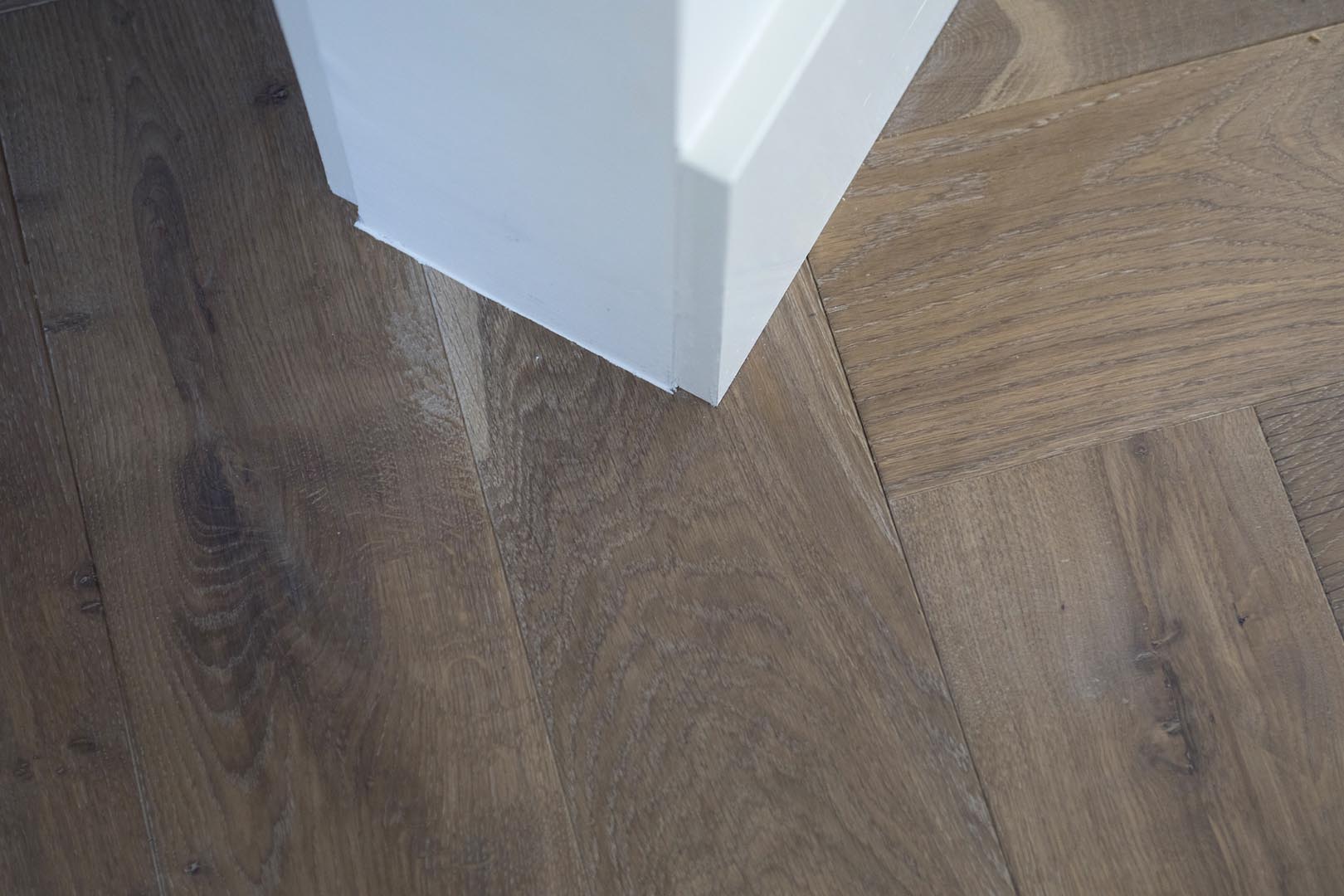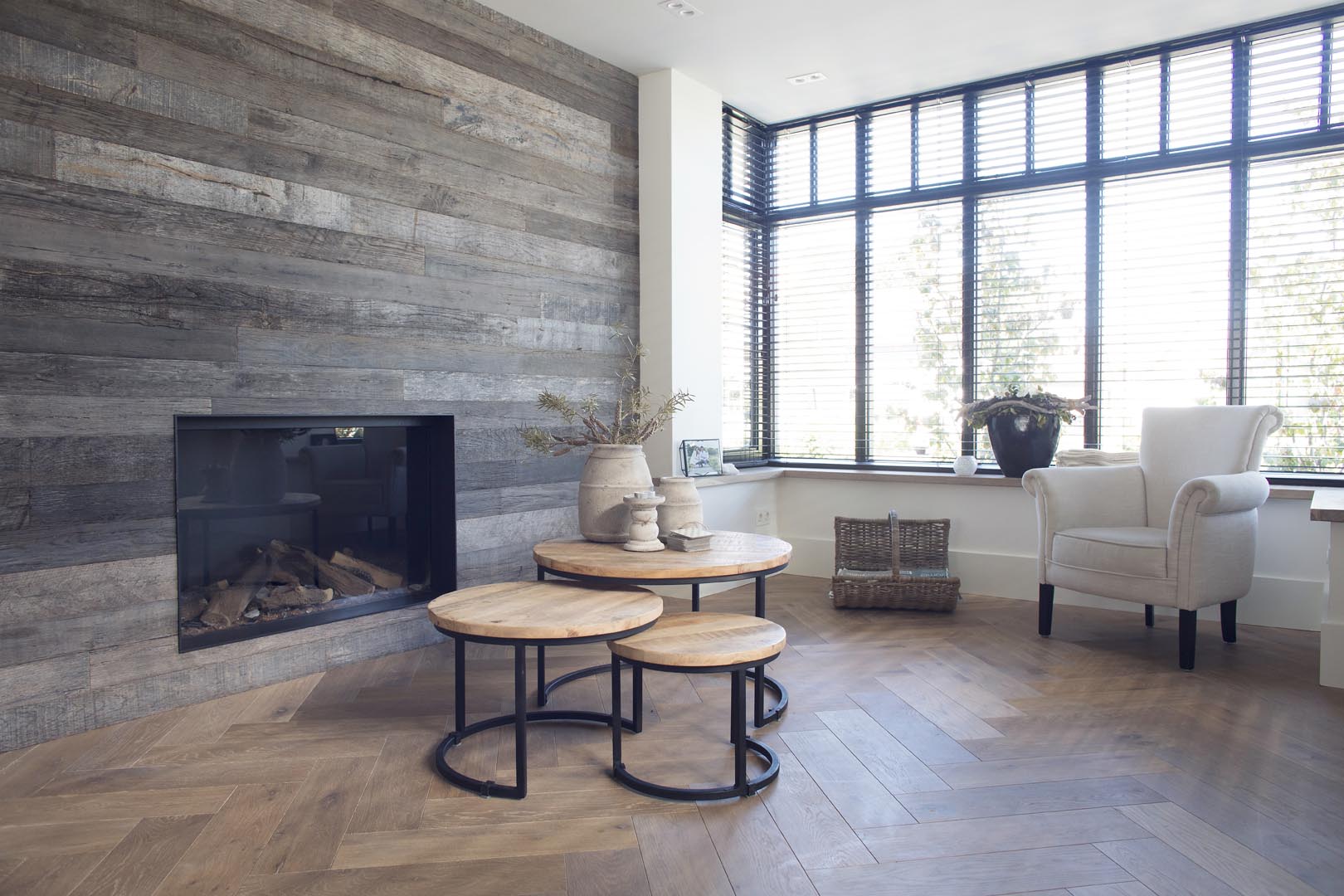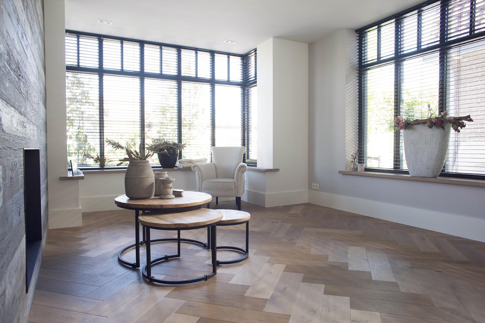 De gerookte visgraatvloer, afgewerkt met olie in de kleur Mix wit, komt goed tot zijn recht in deze gerenoveerde woning. De wand om de openhaard hebben we bekleed met oude eiken delen. Door de vensterbanken en traptreden te oliën in dezelfde kleur als de vloer, ontstaat er een mooi geheel.