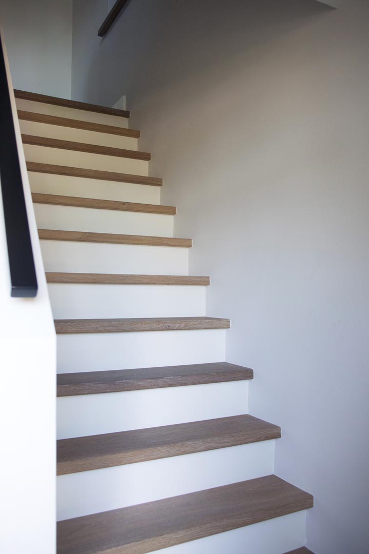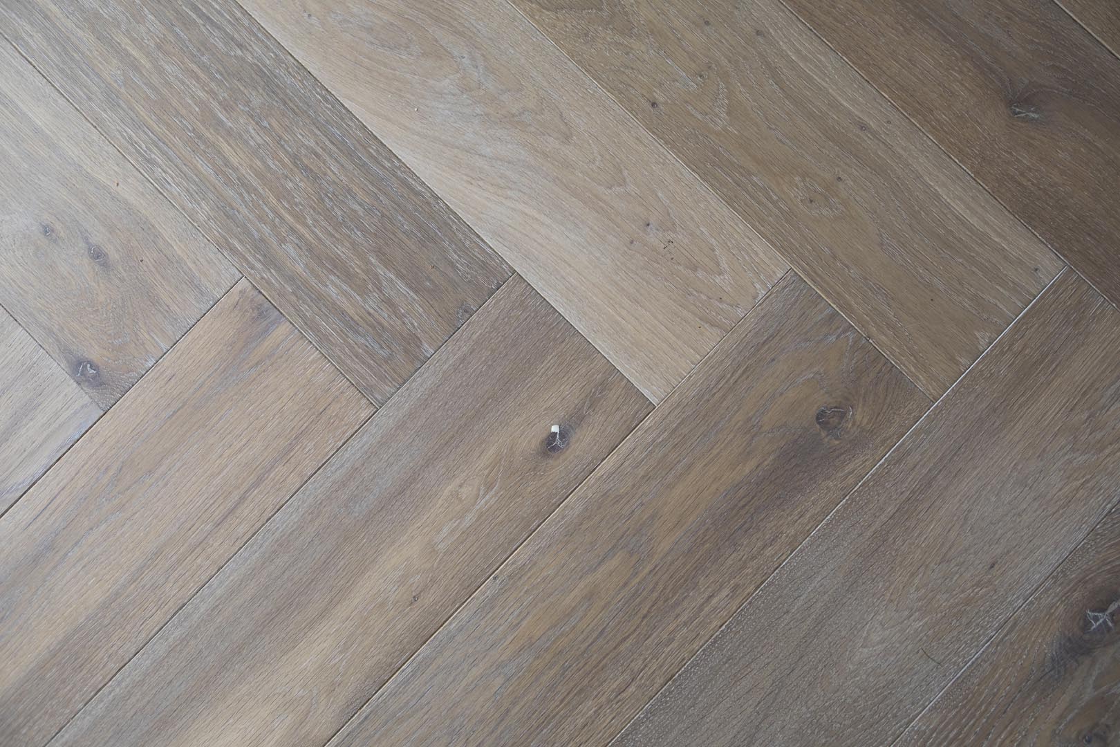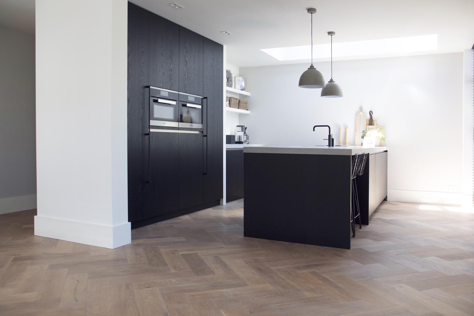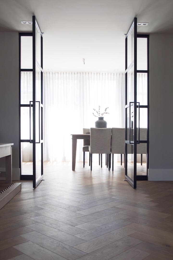 De gerookte visgraatvloer, afgewerkt met olie in de kleur Mix wit, komt goed tot zijn recht in deze gerenoveerde woning. De wand om de openhaard hebben we bekleed met oude eiken delen. Door de vensterbanken en traptreden te oliën in dezelfde kleur als de vloer, ontstaat er een mooi geheel.