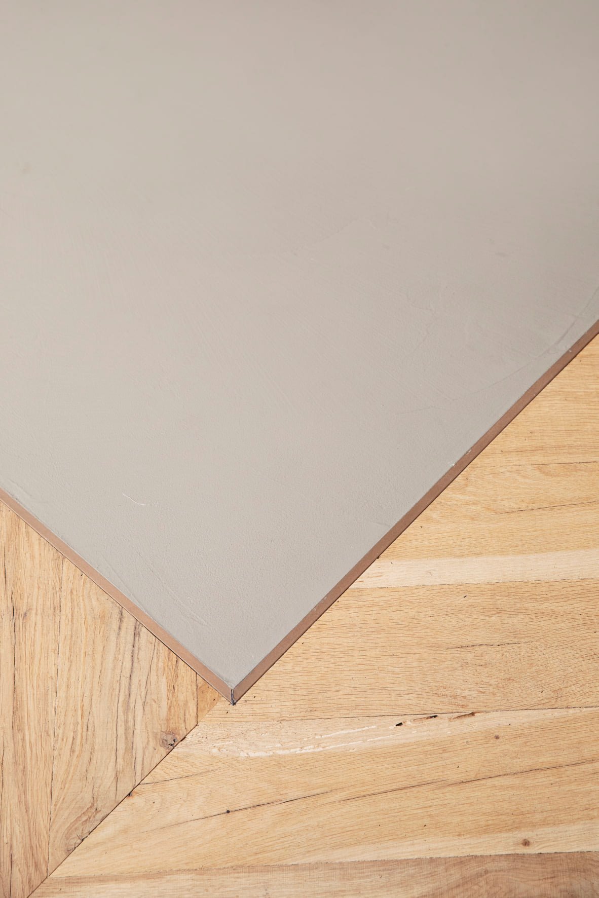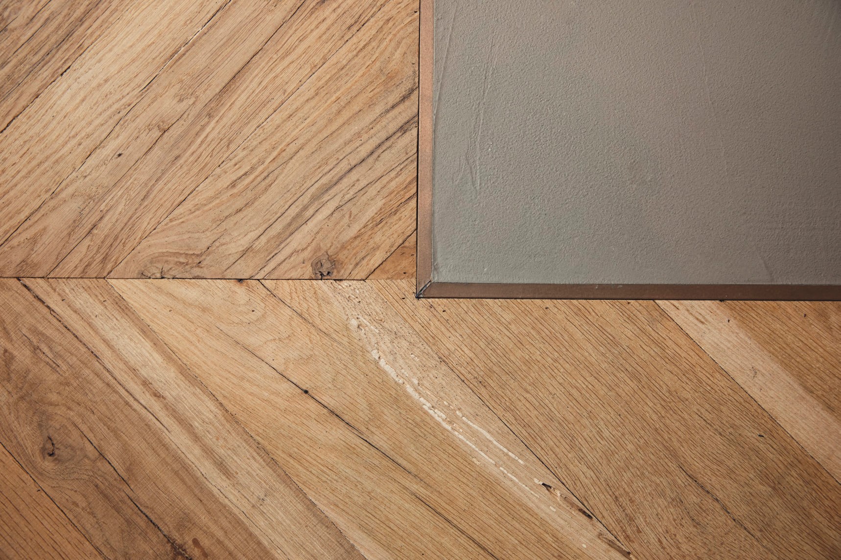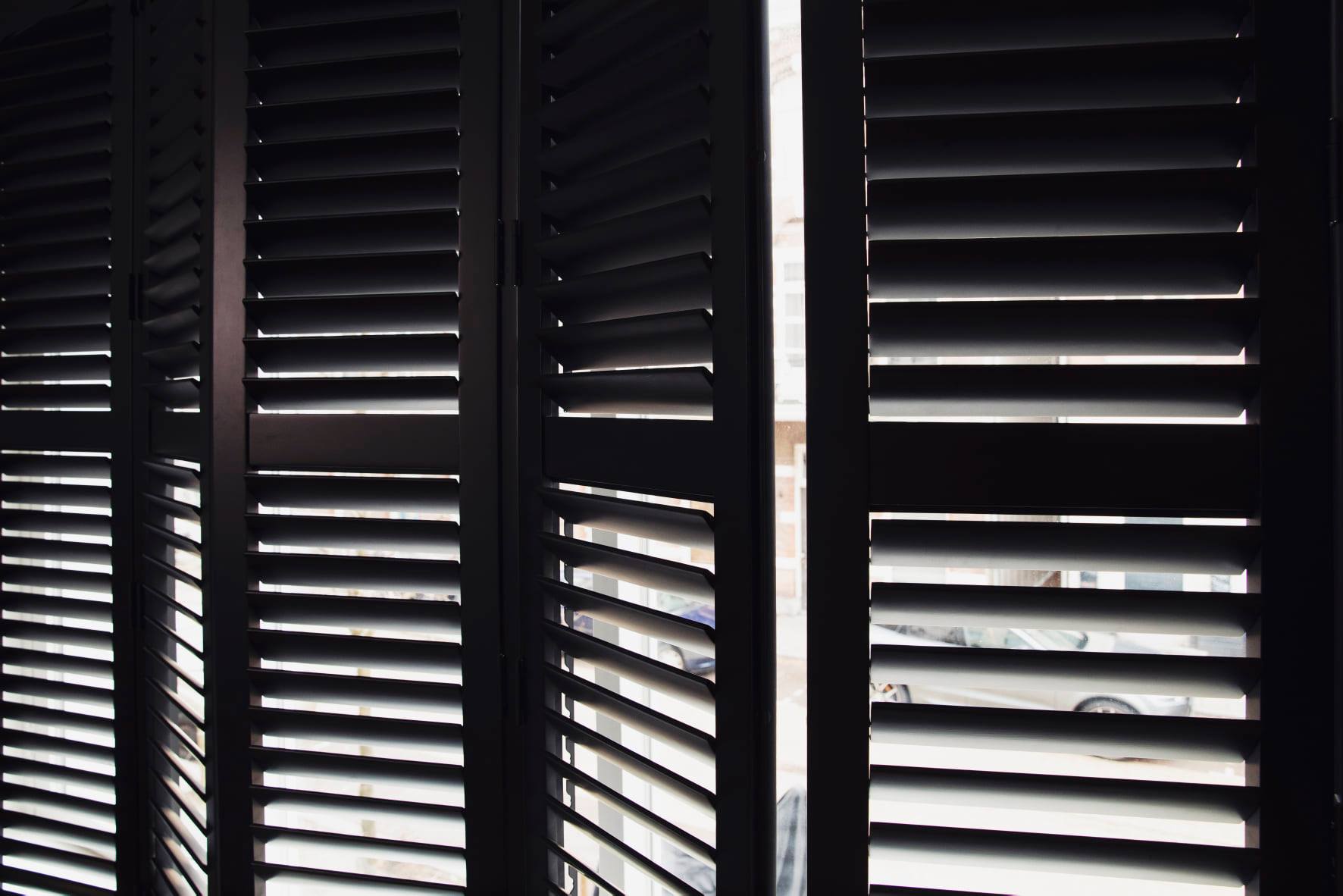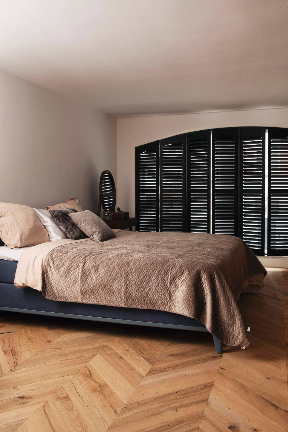 Met als exclusief detail de bronzen bies tussen het hout en de betonnen vloer. De zwarte houten shutters in de slaapkamer zijn geheel op maat gemaakt, waardoor de unieke ronde vorm van het raam is gebleven. Vloer en Shutters: Rein parket