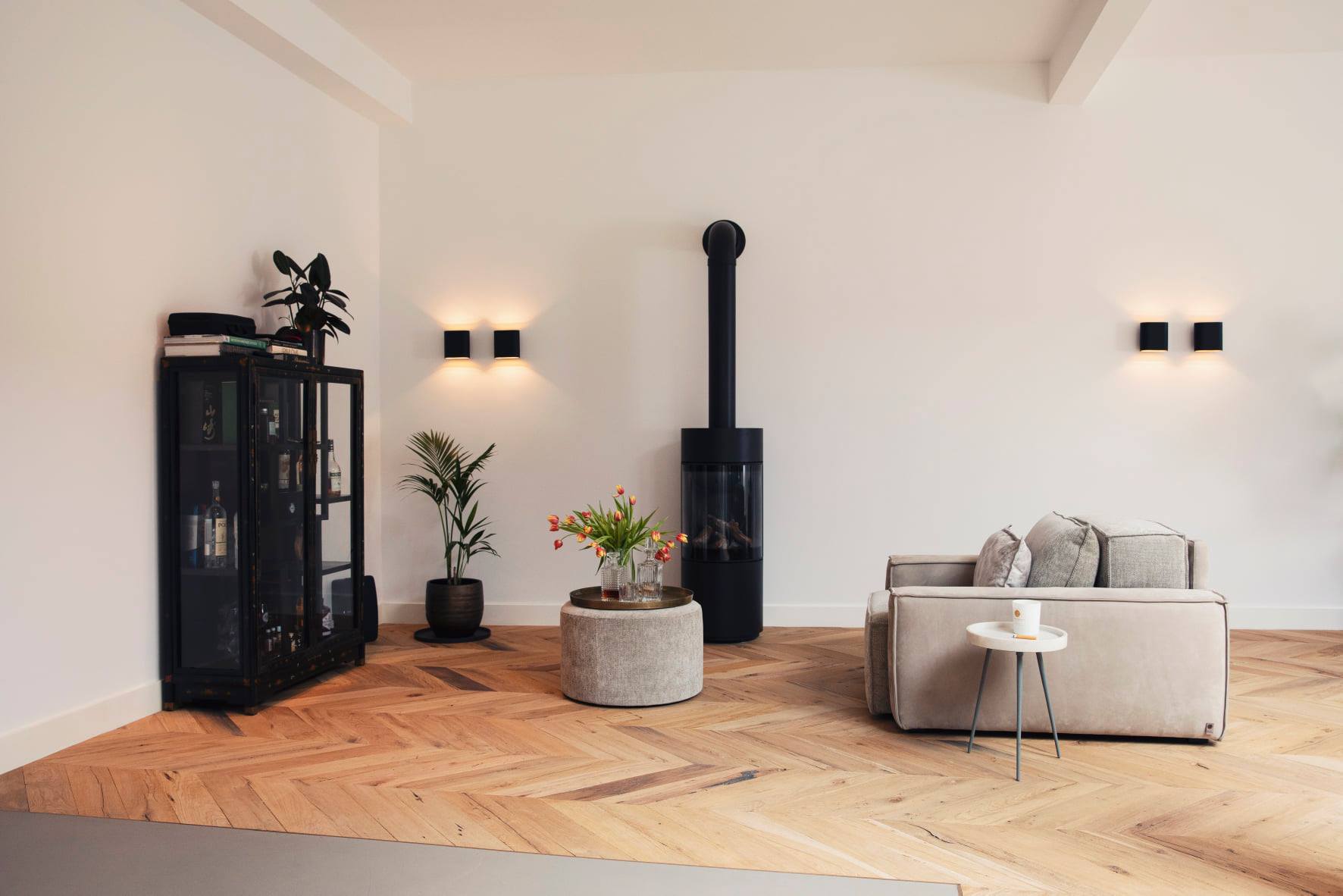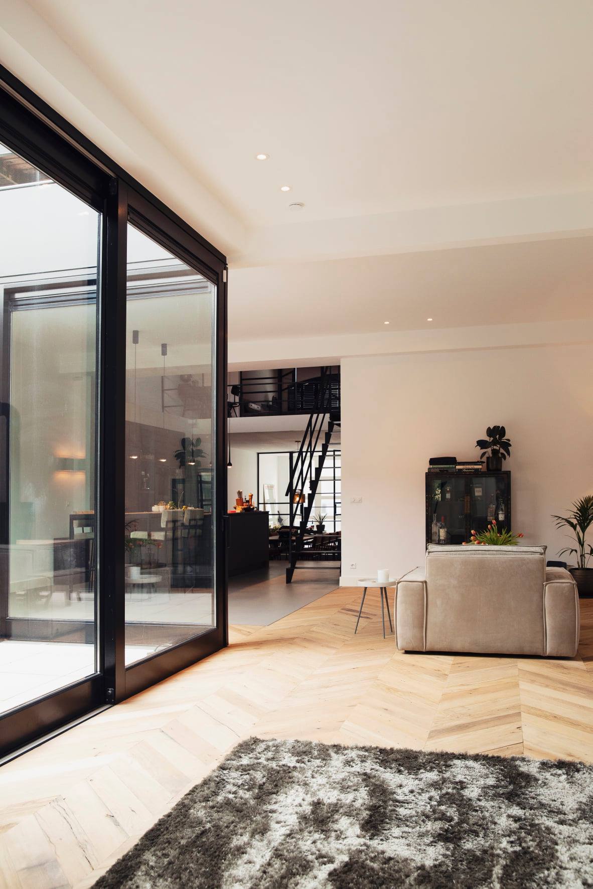 De bewoners hebben het karakter van dit prachtige pand goed in ere gehouden. Industrieel, warm en sfeervol. De houten vloer van eeuwenoud eikenhout is een mooie tegenhanger van de zwarte stalen deuren en de betonnen vloer. Door de vloer in een Hongaarse punt te leggen, krijgt deze een stoere uitstraling.