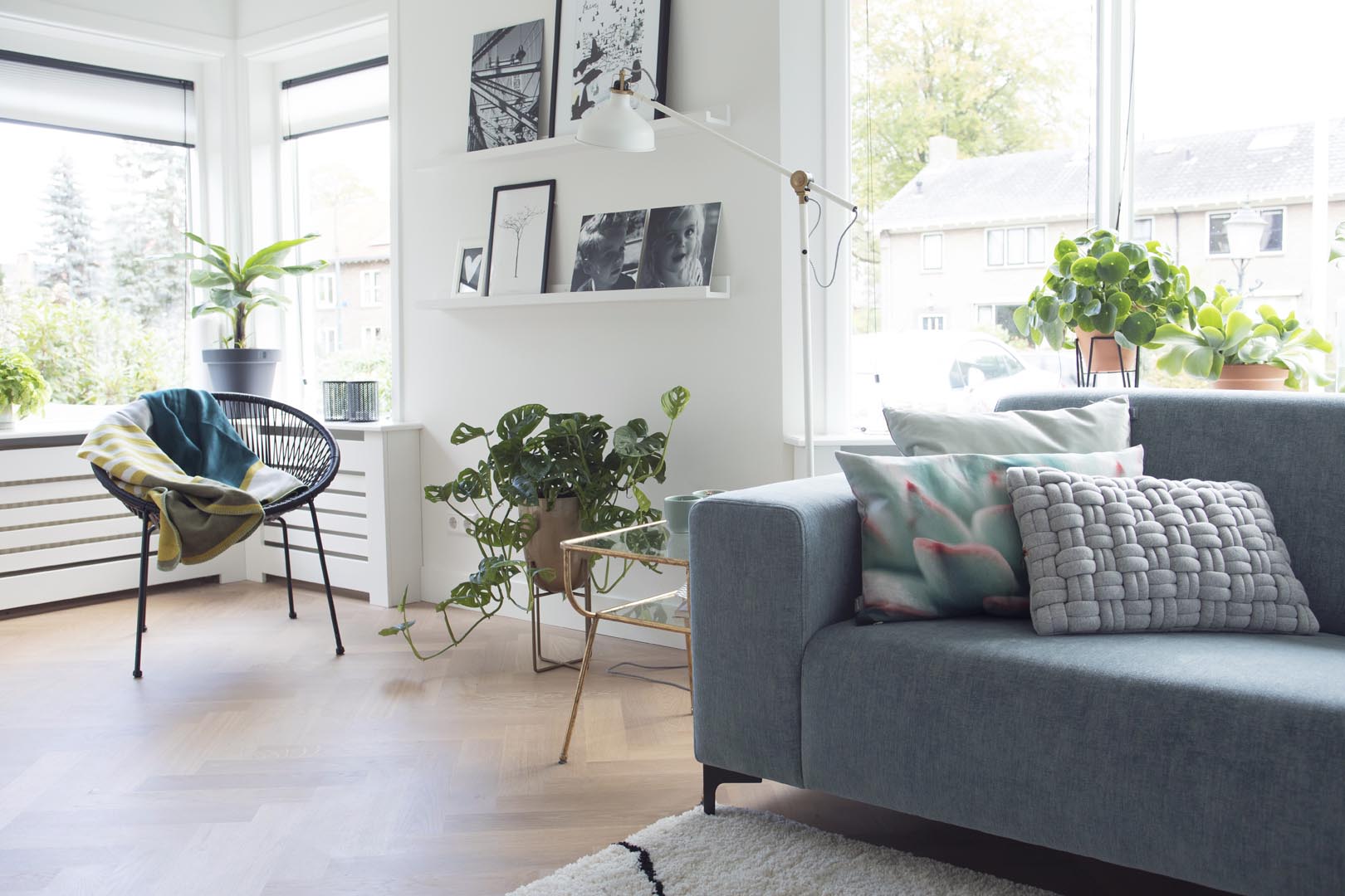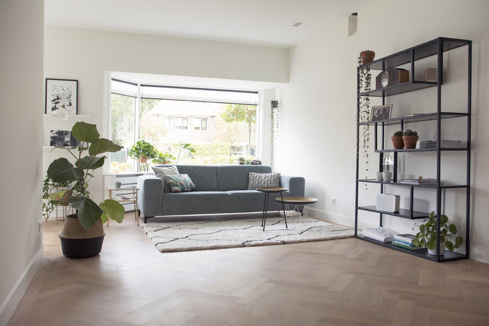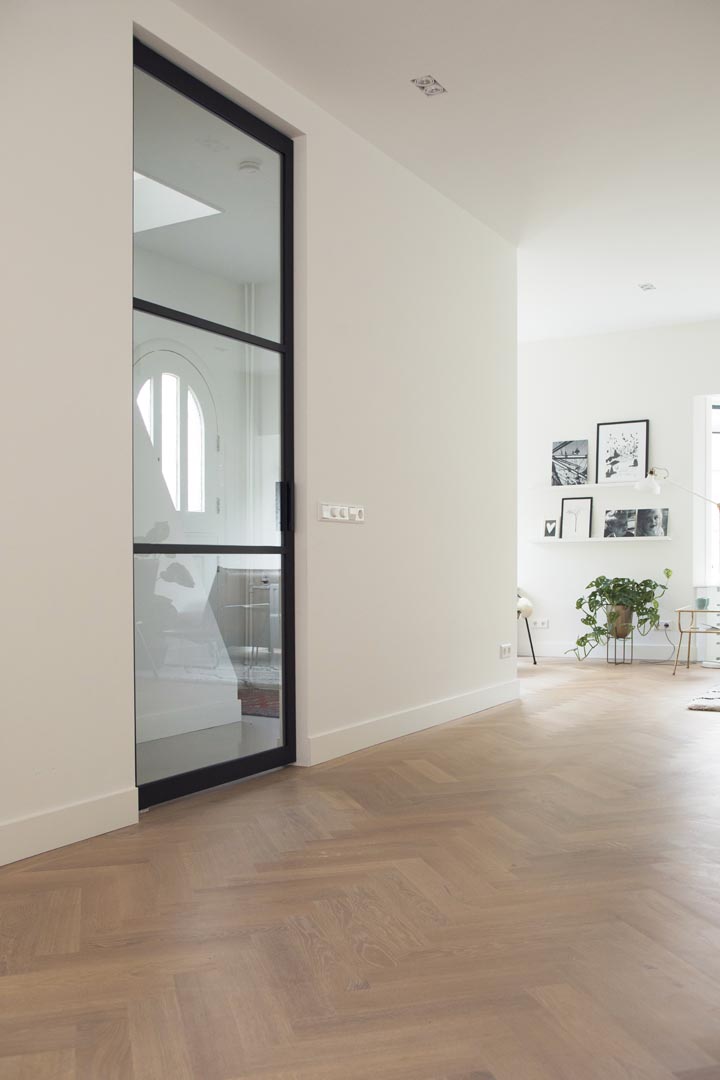 Een schitterend geheel met de Scandinavische inrichting en de stalen deur.