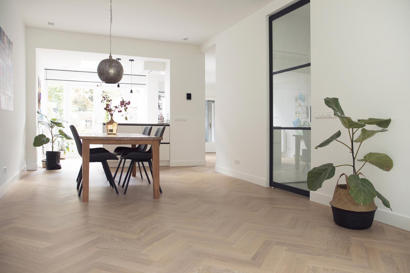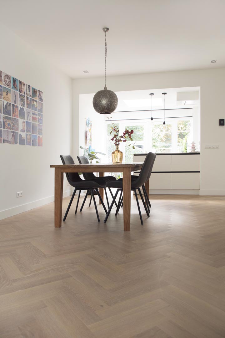 In deze mooie woning in Veenendaal mochten wij een visgraat vloer met band leggen. Een rustiek eiken vloer in de kleur Mix wit, met een naadloze overgang naar de gietvloer in de hal.